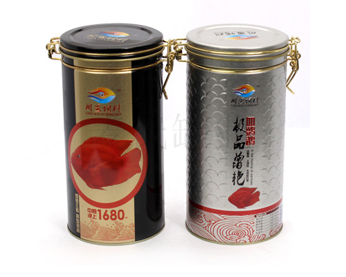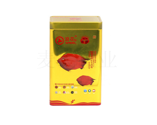 此款魚飼料鐵盒為麥氏罐業為廣大客戶推出的魚飼料鐵盒,此款鐵盒的規格為120*95*149mm。鐵盒的印刷工藝為CMYK+1專,外過水性亮光油,內過符合國家規定的金油,客戶可根據自身產品的需求選擇啞油、皺紋油、爆炸油等印刷工藝。