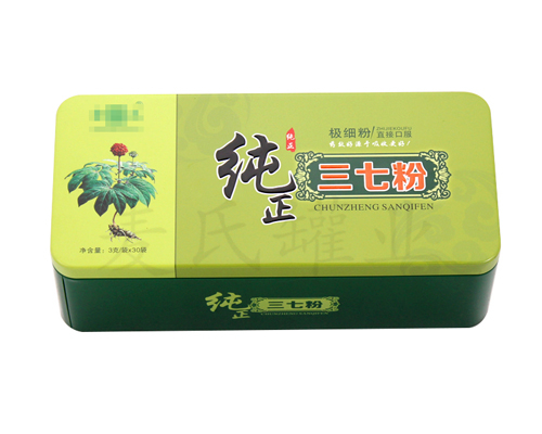 此款三七粉鐵盒包裝搭配精美的印刷圖案,彰顯產品的大方,符合消費市場的需求。此款三七粉鐵盒包裝,印刷安全不掉色,不染色,幫您提升產品的包裝檔次,吸引消費者的青睞,增加產品銷量。